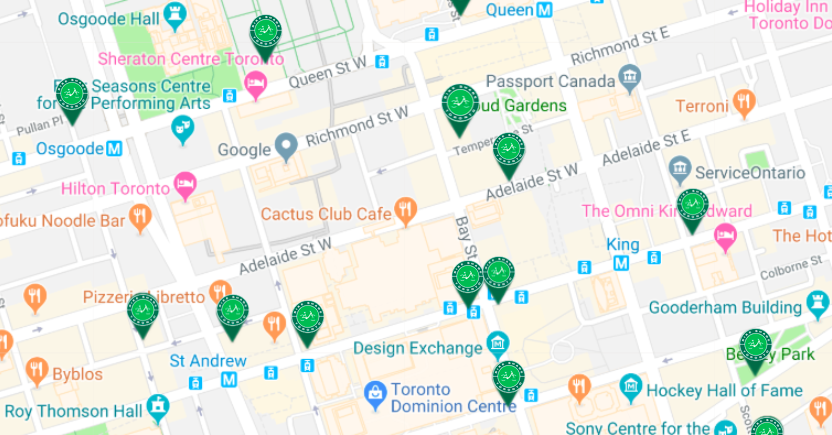 The Financial District supports a plethora of our stations, making decor admiring easier than ever. Pick-up a bike and ride from building to building, docking to get a closer look at your favourites.